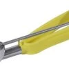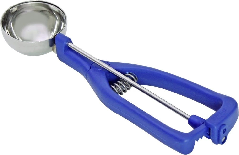 Eisportionierer aus Edelstahl mit blauem Griff aus Kunststoff.