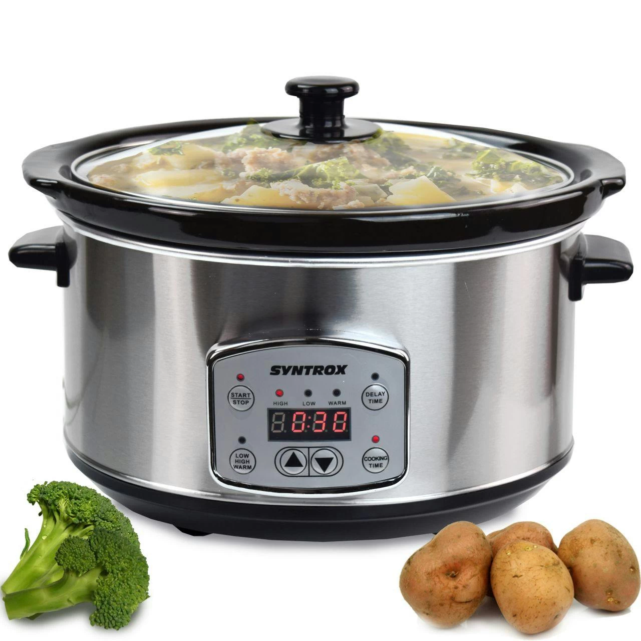 Digitaler Slow Cooker 4,5 Liter mit Timer von Syntrox Germany – top Equipment für die Küche Lange genug haben Sie sich in der Küche herumgeärgert, da Sie einfach nicht das passende Equipment zur Hand hatten? Nun bekommen Sie im Online-Shop Syntrox Germany die Möglichkeit, sich optimal auszustatten und von einem Plus an Komfort zu profitieren. Sie bekommen hier auf der Seite einen digitalen 4,5 Liter Slow Cooker mit Timer, mit dem Sie ganz nach Belieben kochen können. Der Slowcooker aus Edelstahl sieht nicht nur modern und praktisch aus, sondern bietet auch jede Menge Extras und Besonderheiten. Das maximale Fassungsvermögen liegt natürlich bei dem Slow Cooker bei 4,5 Litern. Versehen ist der praktische Cooker mit Griffen und einem einfach zu bedienenden Bedienfeld. Starten Sie mit dem digitalen Slow Cooker mit Timer aus dem Syntrox Germany Store durch, wird das Zubereiten der Leibspeise von nun an denkbar einfach realisiert. Möchten Sie den Slow Cooker aus Edelstahl und Schongarer mit Timer in Funktion bestellen? Mit wenigen Klicks haben Sie das erledigt. Bestellen Sie das Gerät und starten Sie in der Küche richtig durch. Verschiedene Köstlichkeiten zubereiten – mit dem Syntrox Slow Cooker einfach möglich Der Edelstahl-Slowcooker und Schongarer wird Ihnen eine große Hilfe in dem Küchenbereich sein, wenn Sie kochen möchten. Mit diesem praktischen Equipment in der Küche können Sie unter anderem die folgenden Spezialitäten problemlos herstellen: Eintöpfe und Suppen Fonds und Ragouts Schmorgerichte Sicherlich werden Sie staunen, wenn Sie den Slow Cooker das erste Mal in Funktion haben. So einfach war das Kochen bestimmt noch nie. Der Edelstahl Cooker besteht aus einem Keramikinnentopf, einem Glasdeckel und dem äußeren Teil. Das äußere Teil beinhaltet das Heizelement, das für die Erwärmung des Innentopfes notwendig ist. Dank der Tatsache, dass mit dem Slow Cooker lange bei niedrigen Temperaturen gegart wird, bleiben Fisch und Fleisch sehr saftig. Dank dieser Tatsache bleibt der Geschmack vollmundig und aromatisch. Die Servierschüssel, die aus Keramik besteht, ist übrigens sowohl für die Mikrowelle als auch für den Geschirrspüler geeignet. Gut für die Küche ausstatten mit den Küchengeräten aus dem Store Egal, was Sie brauchen, schauen Sie in dem Syntrox Germany Store vorbei und gehen ganz in Ruhe auf Shopping-Tour. Nicht nur den Slowcooker mit 280 Watt maximalen Stromverbrauch finden Sie in dem Online-Shop vor. Es gibt für Sie auch viele andere Küchengeräte zu guten Konditionen. Angeboten werden Ihnen beispielsweise auch Küchenmaschinen und Mixer. Eiswürfelbereiter, Entsafter und Eismaschinen zählen ebenfalls zum Sortiment. Da sollte im Prinzip für jeden Anspruch und Bedarf ein passendes Küchengerät zur Verfügung stehen. Schauen Sie selbst vorbei und bestellen sich nun die hochwertige Technik aus Edelstahl im Online-Shop von Syntrox Germany zu top Konditionen. Die Garzeit ist übrigens an dem Schongarer frei wählbar. Versehen ist das Modell auch mit einer Warmhaltefunktion. Dank der rutschfesten Standfüße hat der Slow Cooker stets einen sicheren Stand. Die Bedienung gestaltet sich auch denkbar einfach. Falls es doch einmal Unklarheiten gibt, hilft die Bedienungsanleitung weiter. Rezeptvorschläge gibt es übrigens auch im Paket. So könnten Sie sich direkt versuchen und schauen, was alles mit dem Kocher möglich ist. Sie könnten auch noch andere Produkte wie Multikocher, Grills und Mixer gebrauchen? In unserem Sortiment finden Sie zahlreiche verschiedene Artikel dieser Art vor. Da findet sich bestimmt auch für Ihren Anspruch und Bedarf das passende Produkt vor. Eigenschaften: Farbe: Edelstahl maximaler Stromverbrauch: 280 Watt Garzeit frei wählbar Warmhaltefunktion Glasdeckel 4,5 Liter Fassungsvermögen Keramik-Innentopf, auch als formschöne Servierschüssel verwendbar rutschsichere Standfüsse Bedienungsanleitung (de/en) mit Rezeptvorschlägen deutscher Stecker Gewicht: ca. 5,75kg Verpackungsmaße: 40 x 33,5 x 27,5cm