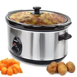 Edelstahl Slowcooker mit 4,5 Liter max. Fassungsvermögen Keramik Servierschüssel geeignet für Geschirrspüler und Mikrowelle Farbe: Edelstahl maximaler Stromverbrauch: 280 Watt Garzeit frei wählbar – Warmhaltefunktion, Glasdeckel – 4,5 Liter Fassungsvermögen – Keramik-Innentopf, auch als formschöne Servierschüssel verwendbar – rutschsichere Standfüsse Spülmaschinengeeignete Zubehörteile (das Gerät an sich natürlich nicht) Bedienungsanleitung in deutscher Sprache, deutscher Stecker