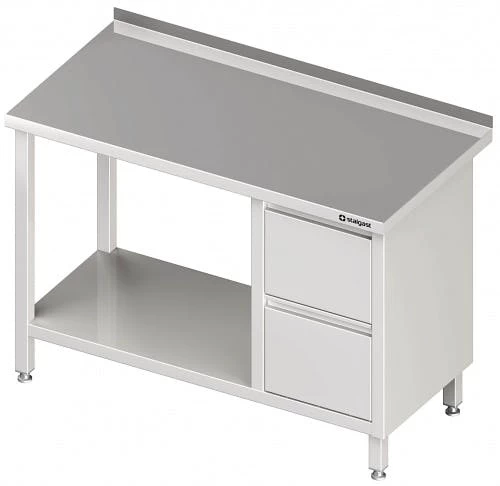 hergestellt aus rostfreiem, ferritischem Stahl, mit und ohne Aufkantung (40 mm Höhe) erhältlich, Arbeitsfläche unterfüttert mit einer doppelt laminierten Schallschutzplatte, Stärke: 18 mm, beim Tisch mit hinterer oder/und seitlicher Aufkantung hinterer oder/und seitlicher laminierten Plattenrand durch umlaufendes korrosionsbeständiges Profil aus Edelstahl geschützt, fest verschweißte Ausführung, höhenverstellbare Füße +25 mm bis -4 mm, Tischbeine aus Vierkantprofil 40×40 mm, Materialstärke: 1,2 mm, mit Schubladenblock links oder rechts, Schubladenhöhe 200mm, Schubladen mit Vollauszug, max. Tragkraft 25 kg, Schubladenschienen mit Kugelführung, doppelwandige Front mit durchgehender Griffleiste, Montage und Demontage der Schubladen ohne Werkzeug möglich, ab einer Breite von 2000 mm mit sechs Beinen ausgestattet