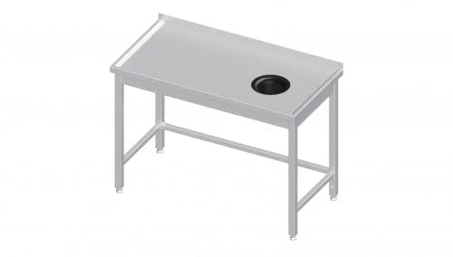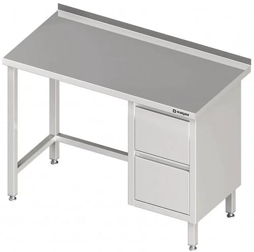 hergestellt aus rostfreiem, ferritischem Stahl, mit und ohne Aufkantung (40 mm Höhe) erhältlich, Arbeitsfläche unterfüttert mit einer doppelt laminierten Schallschutzplatte, Stärke: 18 mm, beim Tisch mit hinterer oder/und seitlicher Aufkantung hinterer oder/und seitlicher laminierten Plattenrand durch umlaufendes korrosionsbeständiges Profil aus Edelstahl geschützt, fest verschweißte Ausführung, höhenverstellbare Füße +25 mm bis -4 mm, Tischbeine aus Vierkantprofil 40×40 mm, Materialstärke: 1,2 mm, mit Schubladenblock links oder rechts, Schubladenhöhe 200mm, Schubladen mit Vollauszug, max. Tragkraft 25 kg, Schubladenschienen mit Kugelführung, doppelwandige Front mit durchgehender Griffleiste, Montage und Demontage der Schubladen ohne Werkzeug möglich, ab einer Breite von 2000 mm mit sechs Beinen ausgestattet