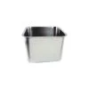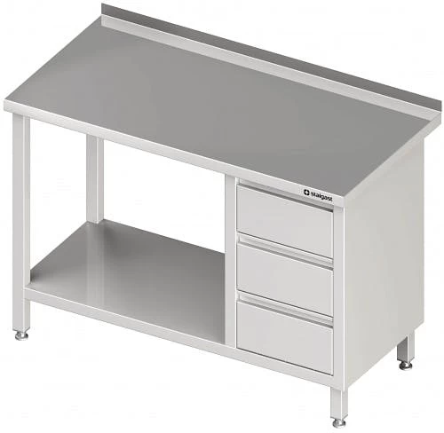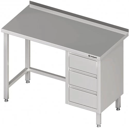 hergestellt aus rostfreiem, ferritischem Stahl, mit und ohne Aufkantung (40 mm Höhe) erhältlich, Arbeitsfläche unterfüttert mit einer doppelt laminierten Schallschutzplatte, Stärke: 18 mm, beim Tisch mit hinterer oder/und seitlicher Aufkantung hinterer oder/und seitlicher laminierten Plattenrand durch umlaufendes korrosionsbeständiges Profil aus Stahl geschützt, fest verschweißte Ausführung, höhenverstellbare Füße +25 mm bis -4 mm, Tischbeine aus Vierkantprofil 40×40 mm, Materialstärke: 1,2 mm, mit Schubladenblock links oder rechts, Schubladenhöhe 150mm, Schubladen mit Vollauszug, max. Tragkraft 25 kg, Schubladenschienen mit Kugelführung, doppelwandige Front mit durchgehender Griffleiste, Montage und Demontage der Schubladen ohne Werkzeug möglich, ab einer Breite von 2000 mm mit sechs Beinen ausgestattet