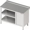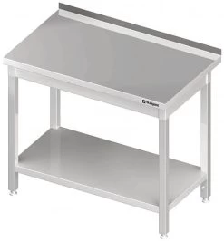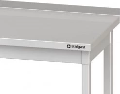 hergestellt aus rostfreiem, ferritischem Stahl, mit und ohne Aufkantung (40 mm Höhe) erhältlich, Arbeitsplatte im oberen Teil durch Rahmen verstärkt (100 mm Höhe), Arbeitsfläche unterfüttert mit einer doppelt laminierten Schallschutzplatte, Stärke: 18 mm, beim Tisch mit hinterer oder/und seitlicher Aufkantung hinterer oder/und seitlicher laminierten Plattenrand durch umlaufendes korrosionsbeständiges Profil aus Edelstahl geschützt., höhenverstellbare Füße +25 mm bis -4 mm, Ausführung: fest verschweißt oder zur Selbstmontage, Tischbeine aus Vierkantprofil 40×40 mm, Materialstärke: 1,2 mm, stabiler Stand, auch ohne Verstrebung, Tische zur Selbstmontage: Besonders robuste Verbindung durch spanlose Herstellung des Gewindes