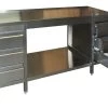 Der Gastro-Spültisch mit 2 Spülbecken & Scharniertüre wird aus rostbeständigem Stahl AISI 430 hergestellt und erfüllt alle erforderlichen funktionellen Anforderungen der professionellen Gastronomie. Er ist mit einer Aufkantung in Höhe von 4cm sowie einer Frontabdeckung ausgestattet, die für zusätzlichen Schutz sorgen. Verstellbare Füße machen den Tisch zudem sehr flexibel. Erhältlich ist der Spültisch in mehreren Größen, die sich jeweils in der Tiefe und Breite unterscheiden.