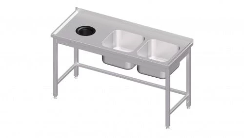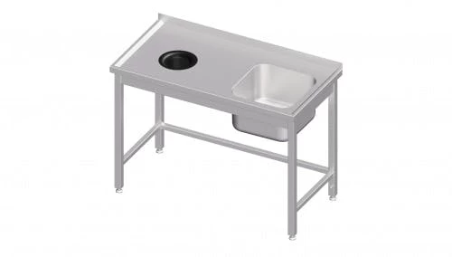 hergestellt aus rostfreiem, ferritischem Stahl, Aufkantung hinten, 40 mm Höhe, fest verschweißte Ausführung, Plattenstärke mindestens 1,2 mm, Beckenstärke 1 mm, umlaufender Wulstrand, 19 mm, Abtropffläche mit Omegaprofilen verstärkt, höhenverstellbare Füße +25 mm bis -4 mm, Tischbeine aus Vierkantprofil 40×40 mm, Materialstärke: 1,2 mm, Lieferung inkl. Überlaufrohr in 180 mm Länge und Abflusssieb, mit Becken links oder rechts, Beckenmaß 400 x 400 x 250 mm bei Tischen mit T = 600 mm, Beckenmaß 400 x 500 x 250 mm bei Tischen mit T = 700 mm & B ? 1100 mm, Beckenmaß 500 x 500 x 250 mm bei Tischen mit T = 700 mm & B > 1100mm, Innendurchmesser der Öffnung: 140 mm, mit entnehmbaren Gummiring